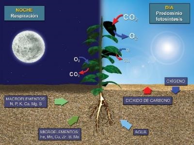 El agua y las sales minerales, suben desde la raíz hasta las hoja, en las hojas se combinan con el dióxido de carbono y gracias a la energía de la la luz del sol se convierten en alimento. Durante la fotosíntesis las plantas toman dióxido de carbono y expulsan oxigeno; todo el oxígeno del aire procede de la fotosíntesis.